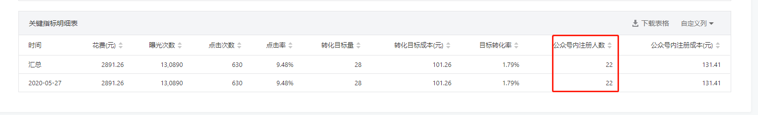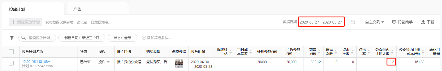 先去微信公众平台,找到日期内,具体广告计划的注册数据(如下图所示)