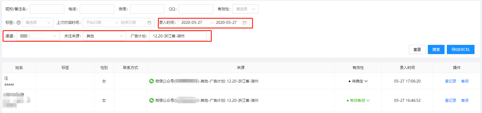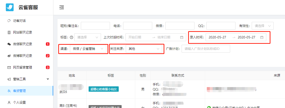 再去云雀【客资管理】中,按照日期、公众号、其他、广告计划筛选客资数据(如下图所示)